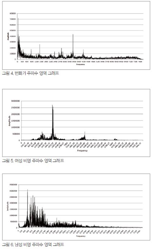 ±×¸² 5¿Í ±×¸² 6Àº °¢°¢ Á÷Á¢ ±¸¼ºÇÑ DBºñ¸íÀÇ ³²¼º, ¿©¼ºÀÇ Á֯ļö ¿µ¿ª ±×·¡ÇÁ¸¦ ³ªÅ¸³½´Ù. ¿©¼º ºñ¸íÀÇ °æ¿ì 1,000Hz¿¡¼ 2,000HzºÎ±Ù ´ë¿ª¿¡¼ Ư¡ÀûÀÎ ¿¡³ÊÁö°¡ ³ªÅ¸³ª¸ç, ³²¼ºÀÇ ºñ¸íÀÇ °æ¿ì 500Hz¿¡¼ 1,500HzºÎ±Ù ´ë¿ª¿¡¼ Ư¡ÀûÀÎ ¿¡³ÊÁö¸¦ ³ªÅ¸³½´Ù.