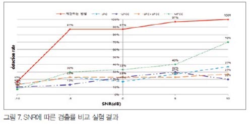 ±×¸² 7Àº SNR¿¡ µû¸¥ °ËÃâ·ü ±×·¡ÇÁÀ̰í, ±×¸² 8Àº SNR¿¡ µû¸¥ ¿ÀÀνķü(FAR) ±×·¡ÇÁÀÌ´Ù. ±×¸² 7¿¡¼ º¸´Â¹Ù¿Í °°ÀÌ SNRÀÌ -5dBÀΠȯ°æ¿¡¼ Á¦¾ÈÇÏ´Â ¹æ¹ýÀÇ °ËÃâ·üÀº 87%ÀÎ ¹Ý¸é ´Ù¸¥ ¹æ¹ýÀº 30% À̳»·Î °ËÃâ·üÀÌ ³·´Ù. ¶ÇÇÑ SNRÀÌ 5dBÀΠȯ°æ¿¡¼´Â Á¦¾ÈÇÏ´Â ¹æ¹ýÀÇ °ËÃâ·üÀº 97%ÀÎ ¹Ý¸é ´Ù¸¥ ¹æ¹ýÀº °¡Àå ³ôÀº °ËÃâ·üÀÌ 40%ÀÌ´Ù.