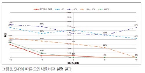 ºñ±³½ÇÇèÀ¸·Î´Â Á¦¾ÈÇÏ´Â ¹æ¹ý°ú ±âÁ¸¿¬±¸µé¿¡¼ ÁøÇàÇß´ø LPC, LPCC, LPC+LPCC, MFCC ÀÌ·¸°Ô 5°¡Áö¿¡ ´ëÇÏ¿©, -10dBºÎÅÍ 10dB±îÁö 5dB¾¿ ¿Ã¸®¸ç 5´Ü°è¿¡ °ÉÃÄ °ËÃâ·ü°ú ¿ÀÀνķü¿¡ ´ëÇØ ÁøÇàÇß´Ù.