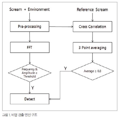 ±×¸² 1Àº ºñ¸í °ËÃâ ¿£Áø ±¸Á¶¸¦ ³ªÅ¸³½ ¼ø¼µµ´Ù. ÀÔ·ÂÀº ºñ¸í°ú ȯ°æÀâÀ½ÀÌ ÇÕ¼ºµÈ µ¥ÀÌÅÍÀ̸ç Pre-processingÀ» ¼öÇàÇÑ µÚ FFT¸¦ ÀÌ¿ëÇÏ´Â ¹æ¹ý°ú Cross correlationÀ» ÀÌ¿ëÇÏ´Â µÎ °¡Áö ¹æ¹ýÀ» ÅëÇØ ºñ¸íÀ» °ËÃâÇÏ°í °ËÃâµÇ´Â ½ÃÁ¡À» ¾Ë·ÁÁÖµµ·Ï ¼³°èÇß´Ù.
