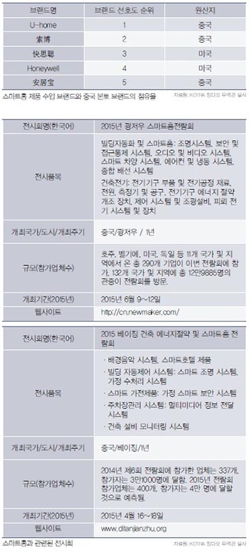 DC Á¶»ç µ¥ÀÌÅÍ¿¡ µû¸£¸é Áß±¹ÀÇ ½º¸¶Æ®È¨Àº 20³âÀÇ ¹ßÀüÀ» °ÅÃÄ ÇöÀç À¶ÇÕ¹ßÀü±â¿¡ ÀÖ´Ù.ÇâÈÄ 3³â¿¡¼ 5³â À̳» Áß±¹ÀÇ ½º¸¶Æ®È¨ ½ÃÀåÀº ºñ±³Àû ºü¸¥ ¹ßÀü ´Ü°è¿¡ ÁøÀÔÇÒ °ÍÀ¸·Î ¿¹»óµÈ´Ù. ¶Ç Çѱ¹ ½º¸¶Æ®È¨ ºê·£µåÀÇ ÀÎÁöµµ´Â ºñ±³Àû ³ôÀº ÆíÀÌ´Ù. ÇöÀç Áß±¹¿¡¼ ºñ±³Àû À¯¸íÇÑ Çѱ¹ ½º¸¶Æ®È¨ ºê·£µå´Â LG ½º¸¶Æ®È¨, Çѱ¹ Çö´ë½º¸¶Æ®È¨, Çѱ¹ KOCOM ½º¸¶Æ®È¨ ½Ã½ºÅÛ ¹× ºôµù ÀÚµ¿È ½Ã½ºÅÛÀÌ´Ù.