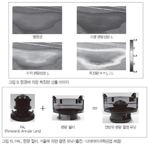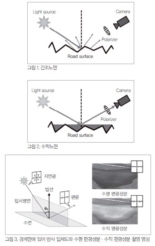 ¿ì¿¡´Ù1)¡3) ¾¾ µîÀÌ ¿¬±¸ÇÑ ³ë¸éÀÇ ¹Ý»ç±¤¿¡¼ º¼ ¼ö ÀÖ´Â Æí±¤ Ư¼ºÀ» ÀÌ¿ëÇØ ¼ö¸·Çö»ó(Hydroplaning)ÀÇ ¿øÀÎÀÌ µÉ ¼ö ÀÖ´Â ³ë¸éÀÇ ½ÀÀ±»óȲÀ» °ËÃâÇÏ´Â ¹æ¹ý ¿ª½Ã ±× Áß Çϳª¶ó°í º¼ ¼ö ÀÖ´Ù. ÀÚ¿¬±¤À» ±¤¿øÀ¸·Î ³ë¸éÀÇ ¼öÁ÷¡¤¼öÆò Æí±¤ ¿µ»óÀ» ÃÔ¿µÇÏ°í ±×°ÍµéÀÇ ÈÖµµ °ªÀÎ ¼öÁ÷¡¤¼öÆò Æí±¤¼ººÐÀ» ºñ±³ÇØ ³ë¸é»óŸ¦ ÀνÄÇÑ´Ù.