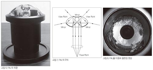 Panoramic Annular Lens(PAL)4)5)¶õ 1985³â Greguss¿¡ ÀÇÇØ °³¹ßµÈ Àü¹æÀ§ ¼¾¼ Áß Çϳª·Î, ´Ù¼öÀÇ ¹Ý»ç±¤ÇÐ ±¸Á¶¸¦ Á¶ÇÕ½ÃŲ Àü¹æÀ§ ·»Áî´Ù. ½Ö°î¸é °Å¿ïÀ» ÀÌ¿ëÇÑ Hyper Omni Vision6)7)°ú ¸¶Âù°¡Áö·Î ƯÀ¯ÀÇ ±¤Çб¸Á¶¸¦ °¡Áö°í ÀÖ´Ù. PAL¿¡´Â 4°³ÀÇ ±¤Çиé(º¼·Ï¸é·»Áî, ¿À¸ñ°Å¿ï, º¼·Ï°Å¿ï, Æò¸é)ÀÌ ÀÏüȵŠÀÖ¾î ±¤ÃàÀÇ Á¶Á¤ÀÌ ºÒÇÊ¿äÇϸç ÀÛ°í Æ°Æ°ÇÏ´Ù´Â °ÍÀÌ Æ¯Â¡ÀÌ´Ù.