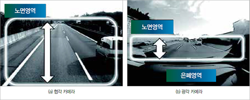 ÇÑÆí, ºí·¢¹Ú½º¿ë Ä«¸Þ¶ó µî ±¤°¢ Ä«¸Þ¶ó(Ȱ¢ÀÌ 120µµ Á¤µµ)´Â ÂïÈ÷´Â °¢µµÀÇ ¹üÀ§´Â ³ÐÁö¸¸ À̹ÌÁö ¾Æ·¡ÂÊ ´ëºÎºÐÀÌ Â÷³» ´ë½Ãº¸µå µî¿¡ °¡·ÁÁ® ³ë¸é¿µ¿ªÀÌ Á¼¾ÆÁö´Âµ¥´Ù°¡ Ä«¸Þ¶ó ºÐÇØ´ÉÀÌ ³·±â ¶§¹®¿¡ ÀÚÂ÷¿¡ °¡±î¿î µµ·Î¿µ¿ª¹Û¿¡ ÃÔ¿µÇÒ ¼ö ¾ø´Ù´Â Á¦¾àÀÌ ÀÖ´Ù(±×¸² 1 (b)).