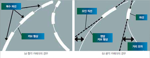 Çù°¢ Ä«¸Þ¶óÀÇ Èò»ö¼± °ËÃâ¹æ½ÄÀ» ±¤°¢ Ä«¸Þ¶ó¿¡ ±×´ë·Î Àû¿ëÇÏ¸é ±¤°¢À¸·Î ÀÎÇÑ ÇØ»óµµÀÇ Á¦¾à ¶§¹®¿¡ ÆÄ¼± Ä¿ºê±æÀ̳ª ´ÙÁß ¼±·Î(°î·üÀÌ Å« Ä¿ºê±æ¿¡¼ °¨¼Ó ¸ñÀûÀ¸·Î ¾ÈÂÊ¿¡ ªÀº ÆÄ¼±ÀÌ ºÎ¼³µÇ¾î ÀÖ´Â µµ·Î)¿¡¼ Èò»ö ¼±À» °ËÃâÇÒ ¼ö ¾ø´Â °æ¿ì³ª Á¤È®ÇÑ µµ·Î Çü»óÀ» ÃßÁ¤ÇÒ ¼ö ¾øÀ» °æ¿ì°¡ »ý°Ü Èò»ö ¼±±îÁöÀÇ °Å¸® ÃßÁ¤ Á¤¹Ðµµ°¡ ÀúÇϵǴ ¹®Á¦°¡ ÀÖ´Ù.