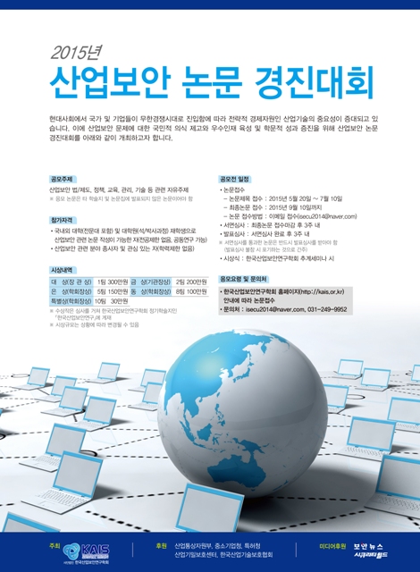 ÀÌ·¯ÇÑ °¡¿îµ¥ »ê¾÷º¸¾È ¹®Á¦¿¡ ´ëÇÑ ±¹¹ÎÀû ÀÇ½Ä Á¦°í¿Í ¿ì¼öÀÎÀç À°¼º ¹× Çй®Àû ¼º°ú ÁõÁøÀ» À§ÇØ ¡®2015 »ê¾÷º¸¾È ³í¹® °æÁø´ëȸ¡¯°¡ °³ÃֵȴÙ. Çѱ¹»ê¾÷º¸¾È¿¬±¸ÇÐȸ(ȸÀå ±è¹Î¹è, www.kais.or.kr)°¡ ÁÖÃÖÇÏ´Â »ê¾÷º¸¾È ³í¹® °æÁø´ëȸ´Â »ê¾÷±â¼ú À¯Ãâ¹æÁö¸¦ À§ÇÑ »ê¡¤ÇС¤¿¬¡¤°üÀÇ °øÁ¶Ã¼Á¦¸¦ °ÈÇØ º¸´Ù È¿°úÀûÀÎ ´ëÃ¥À» ¸¶·ÃÇÏ°í ±â¼úÀ¯Ãâ ¹æÁö¿¡ ´ëÇÑ ±¹¹ÎÀÇ½Ä Á¦°í¸¦ À§ÇØ ¸Å³â °³Ãֵǰí ÀÖ´Ù.
