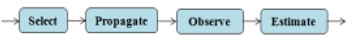 ÆÄƼŬ ÇÊÅÍ´Â ºñ¼±Çü ½Ã½ºÅÛÀÇ »óŸ¦ ¿¹ÃøÇÏ´Â ´ëÇ¥ÀûÀÎ ¹æ¹ýÀ¸·Î ½ÅÈ£ ¹× ¿µ»óó¸®, ·Îº¿ µî ´Ù¾çÇÑ ºÐ¾ß¿¡¼ ³Î¸® »ç¿ëµÇ°í ÀÖ´Ù[10-13]. ÆÄƼŬ ÇÊÅÍ´Â È®·üºÐÆ÷¸¦ °üÃøÀ¸·ÎºÎÅÍ ÁÖ¾îÁö´Â N°³ÀÇ »ùÇà [½Ä »ç¿ë] ·Î ±Ù»çÈÇØ »ç¿ëÇÑ´Ù. ¿©±â¼ [½Ä»ç¿ë]´Â ÆÄƼŬÀ» ³ªÅ¸³»¸ç, [½Ä »ç¿ë]´Â °¢ ÆÄƼŬ¿¡ ´ëÀÀµÇ´Â °¡ÁßÄ¡(Weight)¸¦ ³ªÅ¸³½´Ù. ¼±ÅÃµÈ °¢ »ùÇõéÀº ÀüÆÄ(Propagate) °úÁ¤À» ÅëÇØ º¯ÈµÇ¸ç ±¸ÇØÁø »ùÇÿ¡ ´ëÇØ [½Ä»ç¿ë]À» ±¸Çϰí À̸¦ ÀÌ¿ëÇØ ÃßÁ¤(Estimate) ´Ü°è¿¡¼ °áÁ¤µÈ´Ù[13]. °üÃø(Observe) ´Ü°è¿¡¼´Â °¢ »ùÇÿ¡¼ ÃßÀû ¸ñÇ¥(Target)¿Í À¯»çÇÑ Á¤µµ¸¦ ±¸ÇÏ´Â °üÃø È®·üÀ» ÃøÁ¤Çϰí, ±×¿¡ µû¸¥ °¡ÁßÄ¡¸¦ ºÎ¿©ÇÑ´Ù[14]. ±×¸² 1Àº ÆÄƼŬ ÇÊÅÍ ÃßÀû°úÁ¤À» ³ªÅ¸³½ °ÍÀ̸ç, ÇÑ ÇÁ·¹ÀÓÀÇ ¿µ»ó¸¶´Ù ±×¸² 2ÀÇ ´Ü°è°¡ ¼öÇàµÈ´Ù.