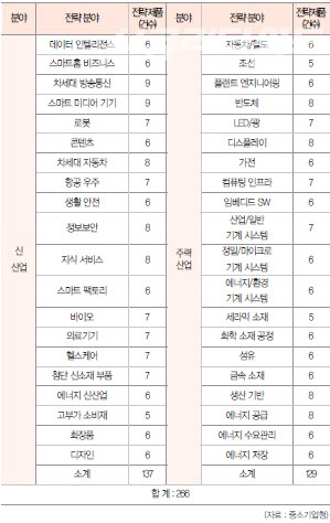Áß±âûÀÌ ¼±Á¤ÇÑ 20´ë ½Å»ê¾÷Àº (1)Â÷¼¼´ë ÀÚµ¿Â÷ (2)½º¸¶Æ® ¹Ìµð¾î ±â±â (3)µ¥ÀÌÅÍ ÀÎÅÚ¸®Àü½º (4)Á¤º¸º¸¾È (5)ÄÜÅÙÃ÷ (6)Áö½Ä ¼ºñ½º (7)µðÀÚÀÎ (8)½º¸¶Æ®È¨/ºñÁî´Ï½º (9)Â÷¼¼´ë ¹æ¼ÛÅë½Å (10)½º¸¶Æ® ÆÑÅ丮 (11)·Îº¿ (12)Ç×°ø ¿ìÁÖ (13)»ýȰ ¾ÈÀü (14)¹ÙÀÌ¿À (16)ÇコÄɾî (17)ÀÇ·á±â±â (18)÷´Ü ½Å¼ÒÀç ºÎǰ (19)¿¡³ÊÁö ½Å»ê¾÷ (20)°íºÎ°¡ ¼ÒºñÀç (21)ÈÀåǰ µîÀÌ´Ù. 20´ë ÁÖ·Â »ê¾÷Àº (1)¿¡³ÊÁö°ø±Þ (2)¿¡³ÊÁöÀúÀå (3)¿¡³ÊÁö ¼ö¿ä (4)°¡Àü (5)ÄÄÇ»ÆÃ ÀÎÇÁ¶ó (6)»ý»ê±â¹Ý (7)±Ý¼Ó ¼ÒÀç (8)ÈÇмÒÀç·°øÁ¤ (9)¼¶À¯ ¼ÒÀç (10)¼¼¶ó¹Í ¼ÒÀç (11)ÀÚµ¿Â÷·Ã¶µµ (12)µð½ºÇ÷¹ÀÌ (13)ÀÓº£µðµå ¼ÒÇÁÆ®¿þ¾î(SW) (14)¹ÝµµÃ¼ (15)Á¶¼± (16)Ç÷£Æ® ¿£Áö´Ï¾î¸µ »ê¾÷ (17)ÀÏ¹Ý ±â°è ½Ã½ºÅÛ (18)Á¤¹Ð·¸¶ÀÌÅ©·Î ±â°è ½Ã½ºÅÛ (19)¿¡³ÊÁö·È¯°æ ±â°è ½Ã½ºÅÛ (20)LED·±¤ µîÀÌ´Ù.