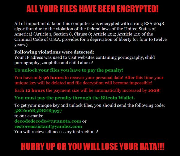 ÇØ´ç ·£¼¶¿þ¾î´Â °¨¿°µÈ PC »ç¿ëÀÚÀÇ IP°¡ ¾Æµ¿ À½¶õ¹° »çÀÌÆ® µî¿¡ Á¢¼ÓÇÏ¿© ¹Ì±¹ ¿¬¹æ¹ýÀ» À§¹ÝÇ߱⠶§¹®¿¡ ¸ðµç Áß¿ä ÆÄÀϵéÀ» ¾ÏÈ£ÈÇßÀ¸´Ï ¹ú±ÝÀ» ³»¶ó°í °æ°íÇÑ´Ù. 96½Ã°£ ÀÌÈÄ¿¡´Â º¹±¸°¡ ºÒ°¡´ÉÇϸç, ¸Å 12½Ã°£¸¶´Ù 100´Þ·¯¾¿ º¹±¸ °¡°ÝÀÌ Áõ°¡ÇÑ´Ù°í Çù¹ÚÇÑ´Ù.