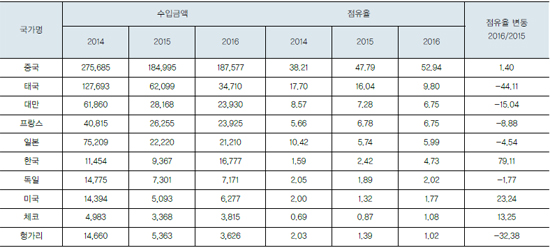 ÃÖ±Ù 3³â°£ ·¯½Ã¾Æ CCTV ¼öÀÔ±¹ ¹× ±Ô¸ð¸¦ »ìÆìº¸¸é Áß±¹ÀÌ ¼öÀÔ¾×°ú Á¡À¯À²¸é¿¡¼ 1À§¸¦ Â÷ÁöÇÑ´Ù. Çѱ¹Àº 6À§ÀÇ ¼öÀÔ±¹À¸·Î 2016³â ±âÁØ 1,677¾ï 7,000¸¸´Þ·¯ ¾îÄ¡¸¦ ·¯½Ã¾Æ¿¡ ¼öÃâÇßÀ¸¸ç Á¡À¯À²Àº 4.73%´Ù. Á¡À¯À² 1À§ÀÇ Áß±¹(52.94%)¿¡ ºñÇØ Å« Â÷À̸¦ º¸ÀÌÁö¸¸, 2015³â ´ëºñ 79.11% È®´ëµÈ °á°ú´Ù.