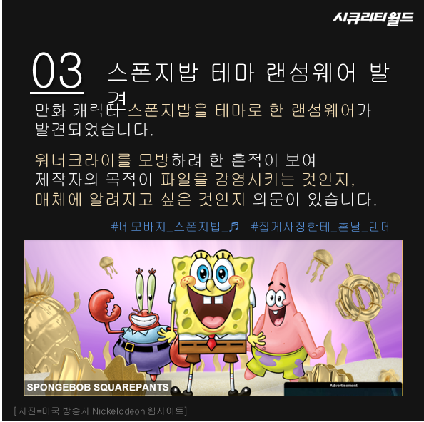 ¸¸È ij¸¯ÅÍÀÎ ½ºÆùÁö¹äÀ» Å׸¶·Î ÇÑ ·£¼¶¿þ¾î°¡ ¹ß°ßµÇ¾ú½À´Ï´Ù.