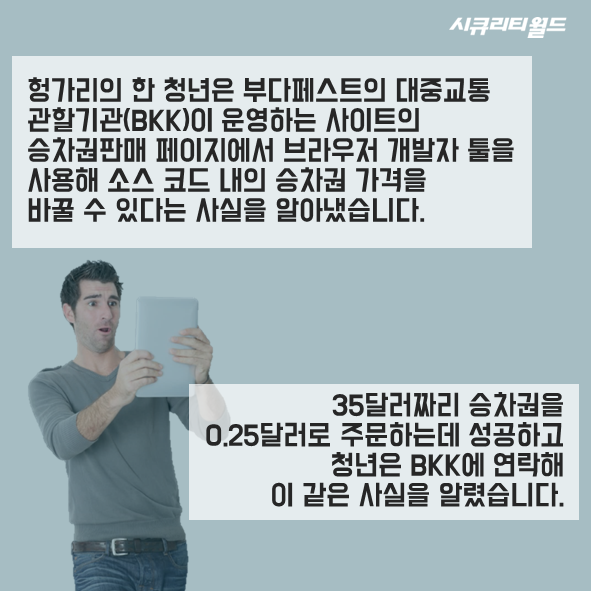 Çë°¡¸®ÀÇ ÇÑ Ã»³âÀº ºÎ´ÙÆä½ºÆ®ÀÇ ´ëÁß±³Åë °üÇÒ±â°ü(BKK)ÀÌ ¿î¿µÇÏ´Â »çÀÌÆ®ÀÇ ½ÂÂ÷±Ç ÆÇ¸Å ÆäÀÌÁö¿¡¼ ºê¶ó¿ìÀú °³¹ßÀÚ ÅøÀ» »ç¿ëÇØ ¼Ò½ºÄÚµå ³»ÀÇ ½ÂÂ÷±Ç °¡°ÝÀ» ¹Ù²Ü ¼ö ÀÖ´Ù´Â »ç½ÇÀ» ¾Ë¾Æ³Â½À´Ï´Ù. 35´Þ·¯Â¥¸® ½ÂÂ÷±ÇÀ» 0.25´Þ·¯·Î ÁÖ¹®Çϴµ¥ ¼º°øÇϰí û³âÀº BKK¿¡ ¿¬¶ôÇØ ÀÌ °°Àº »ç½ÇÀ» ¾Ë·È½À´Ï´Ù.