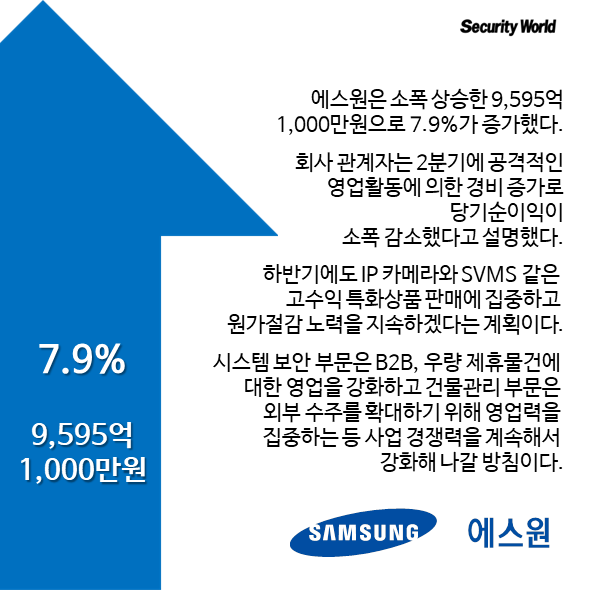 ÇϹݱ⿡µµ IP Ä«¸Þ¶ó¿Í SVMS °°Àº °í¼öÀÍ Æ¯È»óǰ ÆÇ¸Å¿¡ ÁýÁßÇÏ°í ¿ø°¡Àý°¨ ³ë·ÂÀ» Áö¼ÓÇϰڴٴ °èȹÀÌ´Ù. ½Ã½ºÅÛ º¸¾È ºÎ¹®Àº B2B, ¿ì·® Á¦ÈÞ¹°°Ç¿¡ ´ëÇÑ ¿µ¾÷À» °ÈÇÏ°í °Ç¹°°ü¸® ºÎ¹®Àº ¿ÜºÎ ¼öÁÖ¸¦ È®´ëÇϱâ À§ÇØ ¿µ¾÷·ÂÀ» ÁýÁßÇÏ´Â µî »ç¾÷ °æÀï·ÂÀ» °è¼ÓÇØ¼ °ÈÇØ ³ª°¥ ¹æÄ§ÀÌ´Ù.