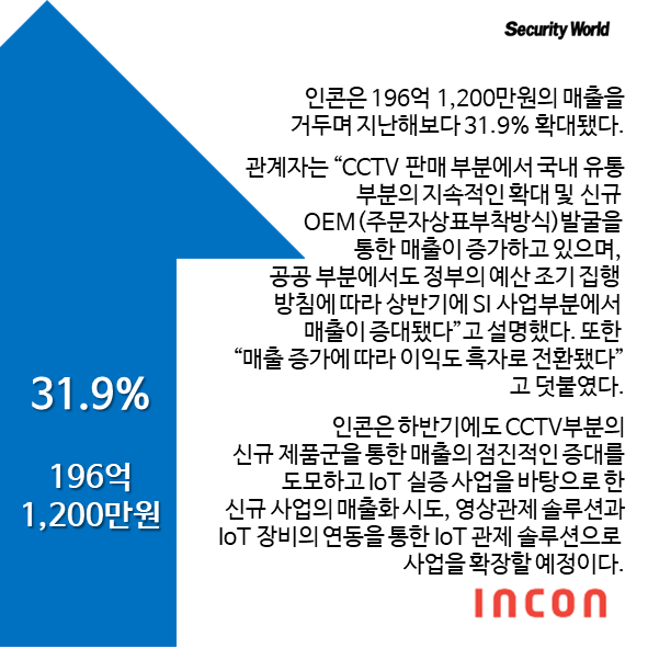 ÀÎÄÜÀº 196¾ï 1,200¸¸¿øÀÇ ¸ÅÃâÀ» °ÅµÎ¸ç Áö³Çغ¸´Ù 31.9% È®´ëµÆ´Ù. °ü°èÀÚ´Â “CCTV ÆÇ¸Å ºÎºÐ¿¡¼ ±¹³» À¯Åë ºÎºÐÀÇ Áö¼ÓÀûÀÎ È®´ë ¹× ½Å±Ô OEM(ÁÖ¹®ÀÚ»óÇ¥ºÎÂø¹æ½Ä) ¹ß±¼À» ÅëÇÑ ¸ÅÃâÀÌ Áõ°¡Çϰí ÀÖÀ¸¸ç, °ø°ø ºÎºÐ¿¡¼µµ Á¤ºÎÀÇ ¿¹»ê Á¶±â ÁýÇà ¹æÄ§¿¡ µû¶ó »ó¹Ý±â¿¡ SI »ç¾÷ºÎºÐ¿¡¼ ¸ÅÃâÀÌ Áõ´ëµÆ´Ù”°í ¼³¸íÇß´Ù. ¶ÇÇÑ “¸ÅÃâ Áõ°¡¿¡ µû¶ó ÀÌÀ͵µ ÈæÀÚ·Î ÀüȯµÆ´Ù”°í µ¡ºÙ¿´´Ù.