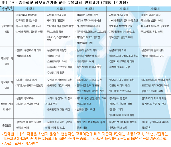 ÃÊ¡¤Áß¡¤°íµîÇб³¿¡¼´Â Á¤º¸Åë½Å±â¼ú±³À°À» ¹Þµµ·Ï µÇ¾îÀÖ´Ù.<Ç¥1 Âü°í> Àü Çг⠿¬°£ 34½Ã°£, 1Çгâ 30½Ã°£À» ÇʼöÀûÀ¸·Î À̼öÇϵµ·Ï µÅ ÀÖ´Ù. ÀÌ Áß Á¤º¸Åë½Å À±¸®(ÀÎÅÍ³Ý À±¸®)¿¡ ´ëÇÑ ºÎºÐÀÌ ¡®Á¤º¸»çȸÀÇ »ýȰ¡¯À̶ó´Â ¿µ¿ªÀ¸·Î Æ÷ÇԵŠÀÖ´Ù. Çг⺰·Î 7½Ã°£ Á¤µµ·Î Æí¼ºµÅ ÀÖÀ¸¸ç ÁÖ¿ä ³»¿ëÀº ´ÙÀ½°ú °°´Ù.
