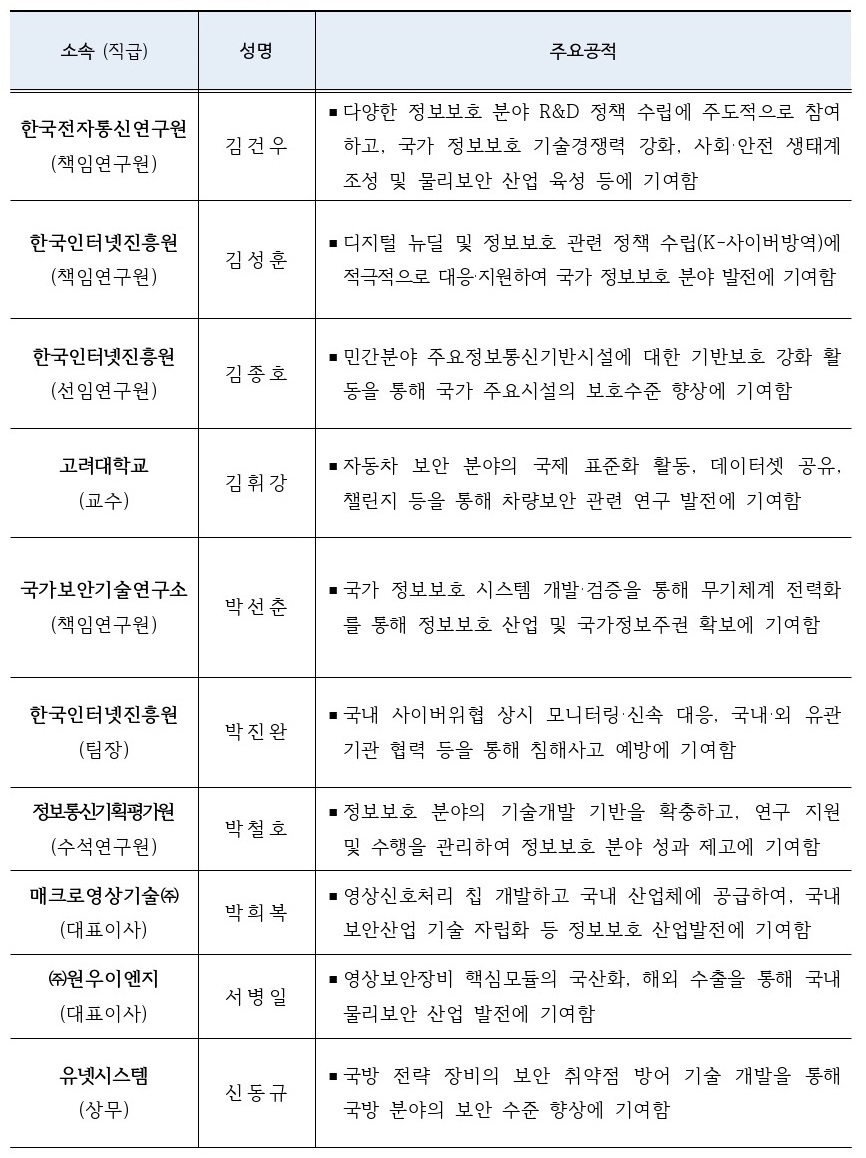 À̾î Á¤º¸º¸È£ ¹ßÀüÀ» À§ÇØ ³ë·ÂÇØ¿Â Á¤º¸º¸È£ À¯°øÀÚ 31¸í(ÈÆÀå 1Á¡, Æ÷Àå 2Á¡, ´ëÅë·É ǥâ 3Á¡, ±¹¹«ÃѸ® ǥâ 4Á¡, Àå°ü ǥâ 21Á¡)¿¡ ´ëÇÑ Á¤ºÎÆ÷»óµµ ÁøÇàµÆ´Ù. ±¹¹ÎÈÆÀå µ¿¹éÀåÀº Çѱ¹Á¤º¸±â¼ú¿¬±¸¿ø À¯ÁØ»ó ¿øÀå, ±¹¹ÎÆ÷ÀåÀº ±¹°¡º¸¾È±â¼ú¿¬±¸¼Ò ¹Ú»ó¿ì Ã¥ÀÓ¿¬±¸¿ø, ±ÙÁ¤Æ÷ÀåÀº ºÎ°æ´ëÇб³ À̰æÇö ±³¼ö°¡ °¢°¢ ¼ö»óÇß´Ù.
