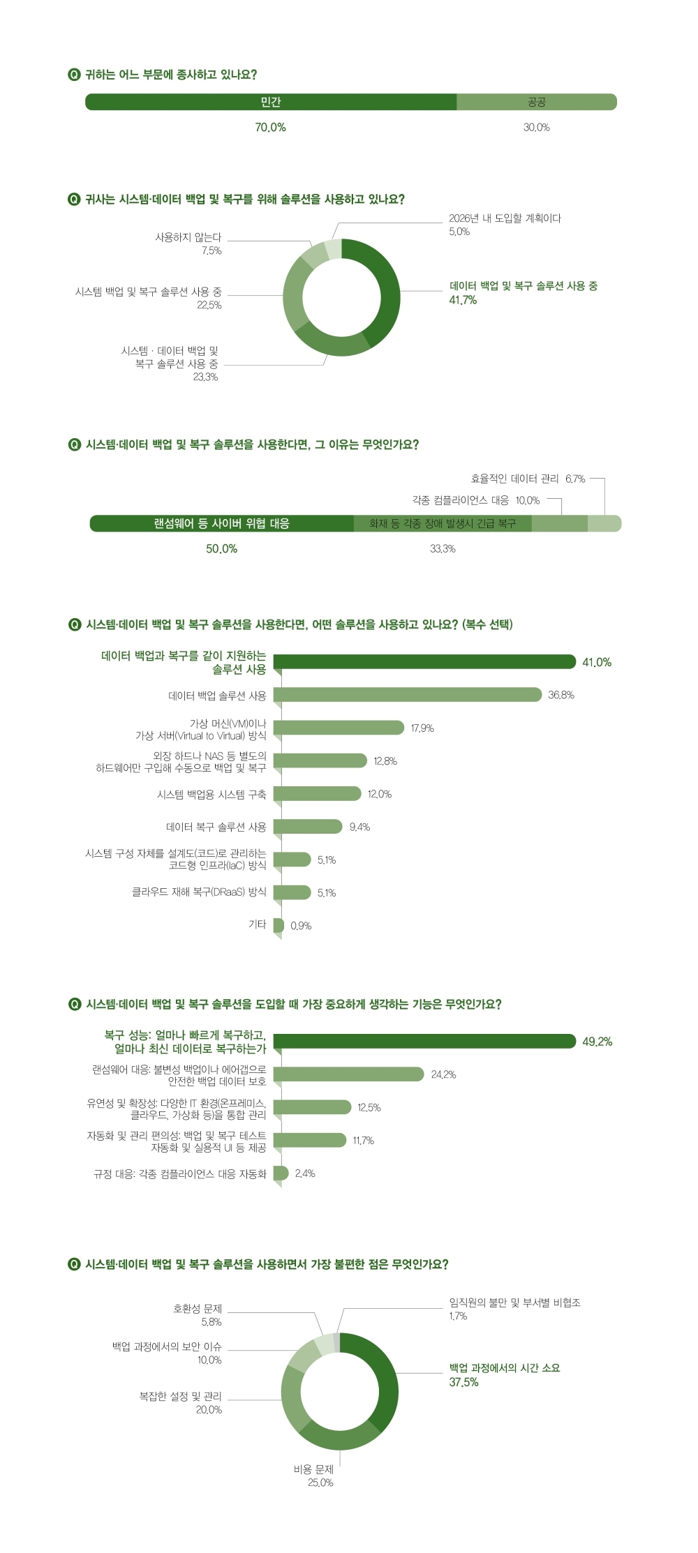 ¸¶Áö¸·À¸·Î ½Ã½ºÅÛ¡¤µ¥ÀÌÅÍ ¹é¾÷ ¹× º¹±¸ ¼Ö·ç¼ÇÀ» »ç¿ëÇϸ鼭 °¡Àå ºÒÆíÇÑ Á¡Àº ¹«¾ùÀÎÁö ¹°¾îºÃ´Ù. »ç¿ëÀÚµéÀÌ °¡Àå ¸¹ÀÌ ºÒÆíÀ» ´À³¢´Â °ÍÀº ¡®¹é¾÷ °úÁ¤¿¡¼­ÀÇ ½Ã°£ ¼Ò¿ä¡¯(37.5%)¿´´Ù. À̾î 25.0%´Â ¡®ºñ¿ë ¹®Á¦¡¯¸¦ ²Å¾ÒÀ¸¸ç, 20.0%´Â ¡®º¹ÀâÇÑ ¼³Á¤ ¹× °ü¸®¡¯¸¦ ¼±ÅÃÇß´Ù. ¶ÇÇÑ 10.0%´Â ¡®¹é¾÷ °úÁ¤¿¡¼­ÀÇ º¸¾ÈÀ̽´¡¯¸¦, 5.8%´Â ¡®È£È¯¼º ¹®Á¦¡¯¸¦, 1.7%´Â ¡®ÀÓÁ÷¿øÀÇ ºÒ¸¸ ¹× ºÎ¼­º° ºñÇùÁ¶¡¯¸¦ °¢°¢ °ñ¶ú´Ù.