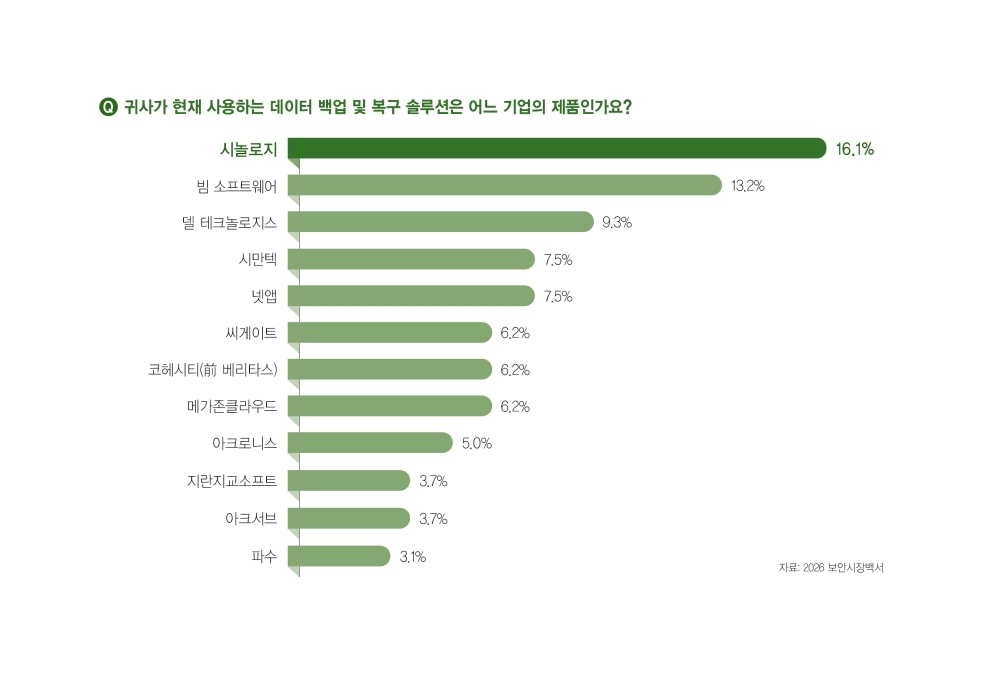 ½ÃÅ¥¸®Æ¼¿ùµå¿Í º¸¾È´º½º°¡ ¹ß°£ÇÑ ¡®2026 º¸¾È ½ÃÀå ¹é¼­¡¯¿¡ µû¸£¸é 2025³â °¡Àå ¸¹Àº »ç¿ëÀÚ°¡ »ç¿ëÇÏ´Â µ¥ÀÌÅÍ ¹é¾÷ ¹× º¹±¸ ¼Ö·ç¼ÇÀº ¡®½Ã³î·ÎÁö¡¯(16.1%)¿´À¸¸ç, ÀÌ¾î ¡®ºö ¼ÒÇÁÆ®¿þ¾î¡¯(13.2%)¿Í ¡®µ¨ Å×Å©³î·ÎÁö½º¡¯(9.3%) ¼ø¼­·Î ¼±ÅÃÀ» ¹Þ¾Ò´Ù. ÇÑÆí, 2026 º¸¾È ½ÃÀå ¹é¼­¿¡´Â ¡®»õ·Î µ¥ÀÌÅÍ ¹é¾÷ ¹× º¹±¸ ¼Ö·ç¼ÇÀ» µµÀÔÇÏ°í ½Í´Ù¸é ¾î´À ±â¾÷ÀÇ Á¦Ç°À» ±¸ÀÔ¡¯ÇÒ °ÍÀÎÁö¿¡ ´ëÇÑ ±¸Ã¼ÀûÀÎ ¼³¹®Á¶»ç ³»¿ëµµ ´ã°å´Ù.
