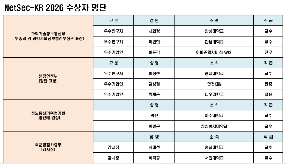 Çѱ¹ÀÎÅͳÝÁøÈï¿øÀÌ ÁÖÃÖÇϰí Çѱ¹Á¤º¸º¸È£ÇÐȸ°¡ ÁÖ°üÇÏ´Â ¡®Á¦32ȸ Á¤º¸Åë½Å¸Á Á¤º¸º¸È£ ÄÁÆÛ·±½º¡¯(NetSec-KR 2026)°¡ 4¿ù 16Àϰú 17ÀÏ, ¾çÀϰ£ ¼¿ï »ï¼ºµ¿ ÄÚ¿¢½º¿¡¼ °³ÃֵƴÙ. ¡®Strong Security Fundamentals for AI Transformation – Èçµé¸² ¾ø´Â º¸¾È ±âÃÊ À§¿¡ ±¸ÇöÇÏ´Â AI ´ëÀüȯ¡¯À» ÁÖÁ¦·Î ¿¸° À̹ø Çà»ç´Â ¹ÌÅ佺¸¦ ºñ·ÔÇØ »ý¼ºÇü AI¿Í ÇÇÁöÄà AI µî »õ·Î¿î ±â¼ú È帧ÀÌ ºü¸£°Ô »çȸ Àü¹Ý¿¡ ¿µÇâÀ» ÁÖ°í ÀÖ´Â »óȲ¿¡¼ º¸¾ÈÀÇ ±Ùº» ¿ä¼Ò¸¦ Á¡°ËÇÏ°í ½ÇÁúÀûÀÎ Àû¿ë ¹æÇâÀ» ¸ð»öÇÏ´Â ÀÚ¸®°¡ µÆ´Ù.