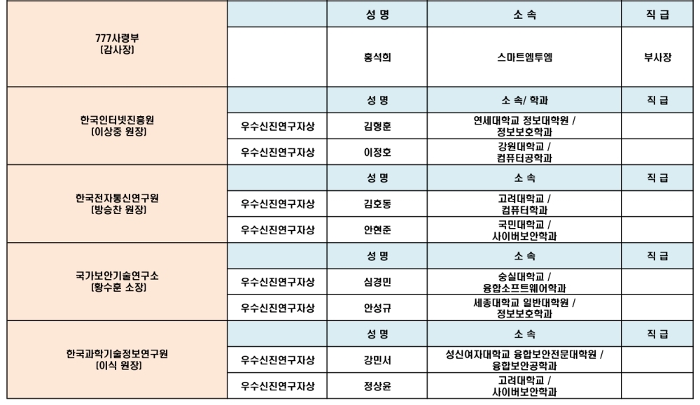 À̾î Á¤º¸º¸È£ À¯°øÀÚ Ç¥Ã¢ÀÌ À̾îÁ³´Ù. ºÎÃѸ® °â °úÇбâ¼úÁ¤º¸Åë½ÅºÎÀå°ü ǥâ°ú ÇàÁ¤¾ÈÀüºÎ ǥâÀ» ºñ·ÔÇØ, Á¤º¸Åë½Å±âȹÆò°¡¿øÀå»ó, ±¹±º¹æÃ¸»ç·É°ü»ó, 777»ç·É°ü»ó, Çѱ¹ÀÎÅͳÝÁøÈï¿øÀå»ó, Çѱ¹ÀüÀÚÅë½Å¿¬±¸¿øÀå»ó, ±¹°¡º¸¾È±â¼ú¿¬±¸¼ÒÀå»ó, Çѱ¹°úÇбâ¼úÁ¤º¸¿¬±¸¿øÀå»ó µî 9°³ ºÐ¾ß 19°³ »óÀÌ ½Ã»óµÆ´Ù.