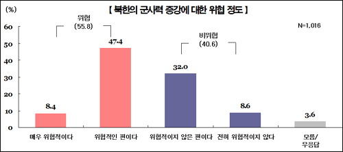 ¶Ç ºÏÇÑÀÇ ±º»ç·Â Áõ°¿¡ ´ëÇØ¼´Â 55.8%°¡ À§ÇùÀ» ´À³¢°í ÀÖÀ¸³ª ºÏÇÑÀÌ ÀüÀïÀ» ´Ù½Ã ÀÏÀ¸Å³ °¡´É¼º¿¡ ´ëÇØ¼´Â 64.2%°¡ ¡®³·´Ù¡¯°í ÀÀ´äÇß´Ù. ³²ºÏÇÑ ¹× ÁÖº¯ °´ë±¹°ú °ü·ÃÇÑ ¾Èº¸ Çö½Ç¿¡ ´ëÇØ û¼Ò³âµéÀÇ ÀνÄÀÌ ¸Å¿ì È¥¶õ½º·¯¿î °ÍÀ¸·Î ºÐ¼®µÆ´Ù.