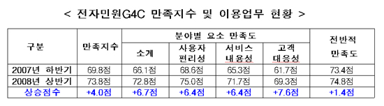 ¡®ÀüÀڹοøG4C(www.egov.go.kr)¡¯ ¸¸Á·Áö¼ö¿¡ À־µ 73.8Á¡À¸·Î Áö³ÇØ ÇϹݱâ 69.8Á¡¿¡ ºñ±³ÇØ 4.0Á¡ »ó½ÂÇÑ °ÍÀ¸·Î ³ªÅ¸³µ´Ù. ¸¸Á·Áö¼ö´Â Àü¹ÝÀû ¹× ºÐ¾ßº° ¸¸Á·µµ¸¦ Æò±ÕÇØ »êÃâÇϴµ¥ 2007³â ÇϹݱ⿡ ºñÇØ ÀüüÀûÀ¸·Î °ñ°í·ç »ó½ÂÇÑ °ÍÀ¸·Î ºÐ¼®µÇ¾ú´Ù. ¶Ç ÀÌ¿ëÇöȲ ºÐ¼®°á°ú¸¦ »ìÆìº¸¸é, 11ȸ ÀÌ»ó ÀÌ¿ëÀÚ°¡ 30.8%¿¡ À̸£°í, ÀÀ´äÀÚÀÇ 89.9%°¡ ¾ÕÀ¸·Îµµ ¡®ÀüÀڹοøG4C¡¯¸¦ »ç¿ëÇϰڴٰí Ç¥½ÃÇß´Ù.