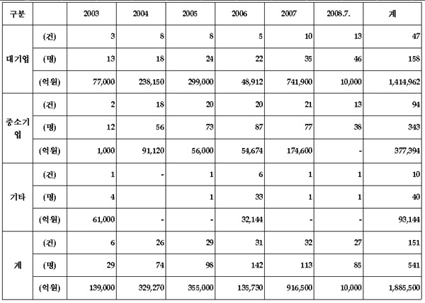 ±¹È¸ Áö½Ä°æÁ¦À§¿øÈ¸ °¿ë¼® Çѳª¶ó´ç ÀÇ¿øÀÌ °ø°³ÇÑ Áß¼Ò±â¾÷û ±¹Á¤°¨»ç ÀÚ·á¿¡ ÀÇÇϸé, Áö³ 2003³âºÎÅÍ 2008³â 7¿ù±îÁö ÃÑ 151°ÇÀÇ ±â¼úÀ¯ÃâÀÌ ¹ß»ýÇß°í, ÇÇÇØ±Ý¾×ÀÇ ±Ô¸ð´Â 188Á¶5õ¾ï¿øÀ» ³Ñ´Â µî ½É°¢ÇÑ »óȲÀ¸·Î ³ªÅ¸³µÀ¸³ª Á¤ºÎÀÇ ¹æÁöÃ¥ÀÌ ÀüÇô È¿°ú¸¦ º¸Áö ¸øÇϰí ÀÖ´Â °ÍÀ¸·Î ³ªÅ¸³µ´Ù.