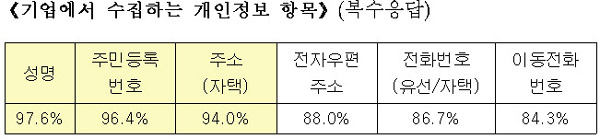 º¹¼ö·Î ÀÀ´äÇÏ°Ô ÇÑ °á°ú, ±â¾÷µéÀÌ ÁÖ·Î ¼öÁýÇÏ´Â °³ÀÎÁ¤º¸´Â ¼º¸í 97.6%, Áֹεî·Ï¹øÈ£96.4%, ÁÖ¼Ò94% µîÀÇ ¼ø¼­¿´À¸¸ç °ÅÀÇ ´ëºÎºÐÀÇ ±â¾÷¿¡¼­ Áֹεî·Ï¹øÈ£¸¦ ¼öÁýÇÏ´Â °ÍÀ¸·Î ³ªÅ¸³µ´Ù.