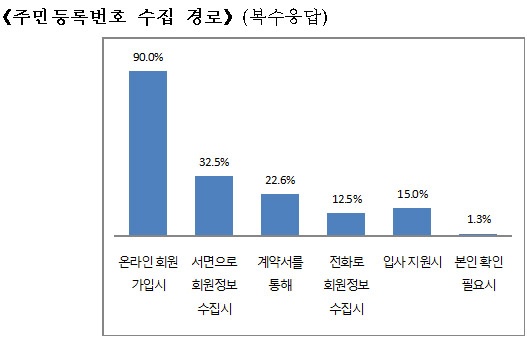 90% ÀÌ»óÀÇ ±â¾÷ÀÌ ¿Â¶óÀΠȸ¿ø °¡ÀÔ°æ·Î·Î ÁֹιøÈ£¸¦ ¼öÁýÇÏÁö¸¸ °è¾à¼­³ª ÀÔ»çÁö¿ø¼­ µî¿¡¼­ °³ÀÎ ÀÚ·á¿¡¼­µµ ÁֹιøÈ£ ¼öÁýÇÏ´Â °ÍÀ¸·Î ³ªÅ¸³µÀ¸¸ç ÀÌ¿Í °°ÀÌ ¿ÀÇÁ¶óÀÎÀ¸·Î ¼öÁýÇÒ °æ¿ì µ¿ÀǸ¦ ¹Þ´Â ±â¾÷Àº 49.4%¿¡ ºÒ°úÇØ ¹®Á¦ÀÇ ½É°¢¼ºÀÌ µå·¯³µ´Ù.