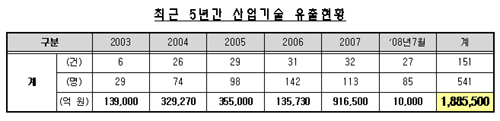 ÇÑÆí Áö½Ä°æÁ¦ºÎ°¡ ±¹°¡Á¤º¸¿ø »ê¾÷±â¹Ðº¸È£¼¾ÅÍ Åë°èÀڷḦ ±Ù°Å·Î ÀÌ ÀÇ¿ø¿¡°Ô ¿¹°áÀ§ ÀÚ·á·Î Á¦ÃâÇÑ ¡®»ê¾÷±â¼ú À¯Ãâ Àû¹ß ÇöȲ¡¯¿¡ ÀÇÇϸé 2003³âºÎÅÍ 2007³â±îÁö »ê¾÷±â¼úÀ» ÇØ¿Ü·Î ³Ñ±â·Á´Ù Àû¹ßµÈ °Ç¼ö°¡ ¸ðµÎ 124°ÇÀ̰í ÀÌ ±â¼úÀÌ ±×´ë·Î ÇØ¿Ü·Î À¯ÃâµÆÀ» °æ¿ì ¿ì¸®³ª¶ó°¡ ÀÔ´Â °æÁ¦Àû ¼Õ½ÇÀº ÃÑ 188Á¶ 5õ¾ï ¿ø¿¡ ´ÞÇÑ´Ù°í ºÐ¼®Çß´Ù.