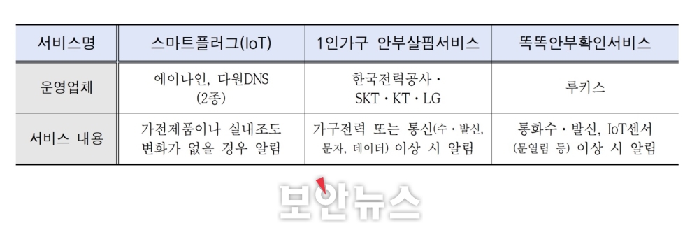 ¼¾ÅÍ´Â ÇöÀç 7,459°¡±¸¸¦ ´ë»óÀ¸·Î ½º¸¶Æ®Ç÷¯±×(IoT), 1Àΰ¡±¸ ¾ÈºÎ»ìÇË µî °í¸³°¡±¸ÀÇ ¾ÈºÎ¸¦ »ìÇDZâ À§ÇØ ÆòÀÏ ¾ß°£ ¹× ÁÖ¸» ÈÞÀÏ ¾ÈºÎ È®ÀÎ ¹× °üÁ¦¡¤Ã⵿ ¼ºñ½º¸¦ ¿î¿µ ÁßÀÌ´Ù.