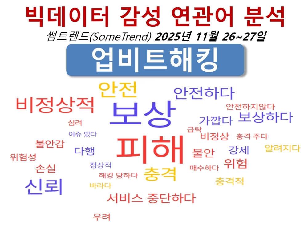 ¿ì¼± ¾÷ºñÆ® ÇØÅ·¿¡ ´ëÇØ ºòµ¥ÀÌÅÍ´Â ¾î¶² ¹ÝÀÀÀ» º¸ÀÏÁö »ìÆìº¸ÀÚ. ºòµ¥ÀÌÅÍ ½ÉÃþ ºÐ¼® µµ±¸ÀÎ ½æÆ®·»µå(SomeTrend)·Î Áö³ 11¿ù 26~27ÀÏ µ¿¾È ¾÷ºñÆ® ÇØÅ·¿¡ ´ëÇÑ ºòµ¥ÀÌÅÍ °¨¼º ¿¬°ü¾î¸¦ µµÃâÇØ º¸¾Ò´Ù. ¾÷ºñÆ® ÇØÅ·¿¡ ´ëÇÑ ºòµ¥ÀÌÅÍ °¨¼º ¿¬°ü¾î´Â ¡®ÇÇÇØ¡¯, ¡®º¸»ó¡¯, ¡®ºñÁ¤»óÀû¡¯, ¡®½Å·Ú¡¯, ¡®¾ÈÀü¡¯, ¡®Ãæ°Ý¡¯, ¡®¾ÈÀüÇÏ´Ù¡¯, ¡®º¸»óÇÏ´Ù¡¯, ¡®¼ºñ½ºÁß´ÜÇÏ´Ù¡¯, ¡®À§Ç衯, ¡®ºÒ¾È¡¯, ¡®°¡±õ´Ù¡¯, ¡®°¼¼¡¯, ¡®´ÙÇ࡯, ¡®¼Õ½Ç¡¯, ¡®ºñÁ¤»ó¡¯, ¡®Ãæ°ÝÀû¡¯, ¡®ºÒ¾È°¨¡¯, ¡®À§Ç輺¡¯, ¡®¿ì·Á¡¯, ¡®¾Ë·ÁÁö´Ù¡¯, ¡®¾ÈÀüÇÏÁö¾Ê´Ù¡¯, ¡®ÇØÅ·´çÇÏ´Ù¡¯, ¡®Ãæ°ÝÁÖ´Ù¡¯, ¡®±Þ¶ô¡¯, ¡®½É·Á¡¯, ¡®¹Ù¶ó´Ù¡¯, ¡®Á¤»óÀû¡¯, ¡®¸Å¼öÇÏ´Ù¡¯, ¡®À̽´ÀÖ´Ù¡¯ µîÀ¸·Î ³ª¿Ô´Ù(À§ ±×¸²).