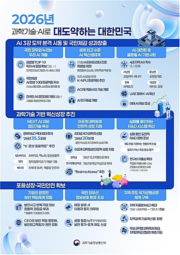 °úÇбâ¼úÁ¤º¸Åë½ÅºÎ´Â 12ÀÏ ¼¼Á¾ÄÁº¥¼Ç¼¾ÅÍ¿¡¼ ÀÌ °°Àº ³»¿ëÀ» ´ãÀº ¡®2026³âµµ ¾÷¹«°èȹ¡¯À» ´ëÅë·É¿¡°Ô º¸°íÇß´Ù. À̹ø º¸°í´Â °ú±âÁ¤ÅëºÎ°¡ 17³â ¸¸¿¡ ºÎÃѸ® Á¶Á÷À¸·Î ½Â°ÝµÈ ÀÌÈÄ Ã³À½ ³»³õÀº Á¾ÇÕ Ã»»çÁøÀ¸·Î, ¡®AI ¼¼°è 3´ë °±¹ µµ¾à¡¯°ú ¡®¾öÁ¤ÇÑ Á¤º¸º¸È£ ü°è Á¤¸³¡¯À» ¾ç´ë ÃàÀ¸·Î »ï¾Ò´Ù.