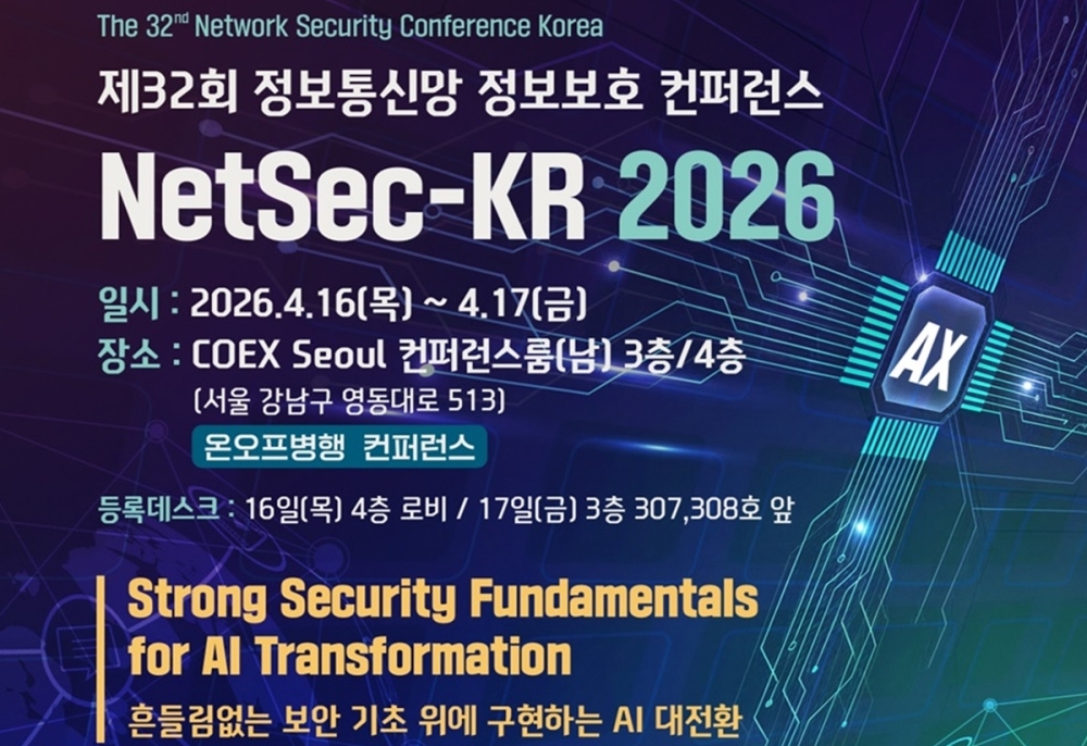 [º¸¾È´º½º ¿øº´Ã¶ ±âÀÚ] Çѱ¹ÀÎÅͳÝÁøÈï¿ø(¿øÀå ÀÌ»óÁß, KISA)ÀÌ ÁÖÃÖÇϰí Çѱ¹Á¤º¸º¸È£ÇÐȸ(ȸÀå ±èÈ£¿ø, KIISC)°¡ ÁÖ°üÇÏ´Â Á¦32ȸ Á¤º¸Åë½Å¸Á Á¤º¸º¸È£ ÄÁÆÛ·±½º(NetSec-KR 2026)°¡ ¿À´Â 4¿ù 16ÀÏ(¸ñ)ºÎÅÍ 17ÀÏ(±Ý)±îÁö ÀÌÆ²°£ ¼¿ï »ï¼ºµ¿ ÄÚ¿¢½º¿¡¼ °³ÃÖµÉ ¿¹Á¤ÀÌ´Ù.