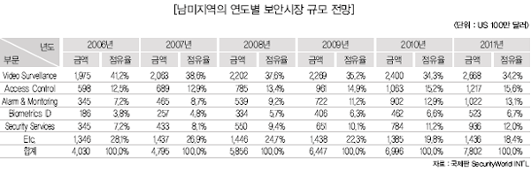 ¤ýÁö³ÇØ Àü ¼¼°è º¸¾È½ÃÀåÀÇ 6.9%ÀÎ 58¾ï ´Þ·¯¿¡ ´ÞÇÑ °ÍÀ¸·Î ÃßÁ¤µÇ´Â ³²¹Ì º¸¾È½ÃÀåÀº ¿ÃÇØ 64¾ï ´Þ·¯¿¡ ´ÞÇÏ¸é¼ Àüü ½ÃÀåÀÇ 7.1%¸¦ Â÷ÁöÇÒ °ÍÀ¸·Î Àü¸ÁµÊ. ºÎ¹®º°·Î´Â ¿µ»ó°¨½Ã ½ÃÀåÀÌ 35.2%, ÃâÀÔÅëÁ¦ ½ÃÀåÀÌ 14.9%, ¾Ë¶÷ ¸ð´ÏÅ͸µ ½ÃÀåÀÌ 11.2%¿¡ À̸¦ °ÍÀ¸·Î ¿¹»óµÊ.