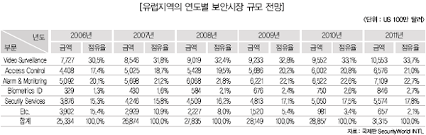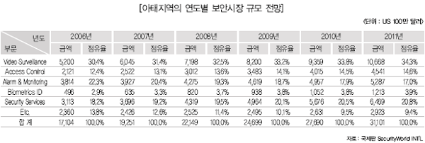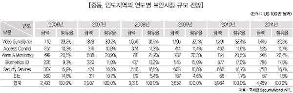 ¤ý2008³â Àü ¼¼°è º¸¾È½ÃÀåÀÇ 3.9%ÀÎ 33¾ï ´Þ·¯¿¡ ´ÞÇÑ °ÍÀ¸·Î Ãß»êµÇ´Â Áßµ¿ ¹× ÀεµÀÇ º¸¾È½ÃÀåÀº ¿ÃÇØ ¾à 3¾ï ´Þ·¯ Áõ°¡ÇÑ 36¾ï ´Þ·¯¿¡ ´ÞÇØ Àüü ½ÃÀåÀÇ 4%¸¦ Â÷ÁöÇÒ °ÍÀ¸·Î º¸ÀÓ.