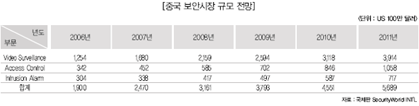 ¤ý2008³â Áß±¹ÀÇ Àüü º¸¾È ½Ã½ºÅÛ ½ÃÀåÀº ¾à 32¾ï ´Þ·¯¿´°í, ÀÌÁß CCTV/¿µ»ó°¨½Ã ½ÃÀåÀº °¡Àå Å« ½ÃÀåÀÏ »Ó¸¸ ¾Æ´Ï¶ó, ¼ºÀå·ü ¶ÇÇÑ ÃâÀÔÅëÁ¦¿Í ħÀÔŽÁö ¾Ë¶÷ ½ÃÀåÀ» ÈξÀ »óȸÇÔ. 2008³â ½ÃÀ屸¼ºÀº CCTV/¿µ»ó°¨½Ã°¡ 68.3%, ÃâÀÔÅëÁ¦°¡ 18.5%, ħÀÔŽÁö ¾Ë¶÷ÀÌ 13.2%¿´°í, Àα¸ ´ëºñ ¸ÅÃâ·Î º» Áß±¹ÀÇ º¸¾È½Ã½ºÅÛ ½ÃÀåħÅõÀ²Àº EU Æò±ÕÀÇ 6% ¹Û¿¡ µÇÁö ¾Ê¾Æ ¼ºÀå ÀáÀç·ÂÀÌ ¾öû³ª´Ù°í ÇÒ ¼ö ÀÖÀ½. Áß±¹Àº 2018³â ºÏ¹Ì½ÃÀåÀ» ´É°¡Çϸç Àü ¼¼°è¿¡¼ °¡Àå Å« ´ÜÀÏ ±¹°¡ ½ÃÀåÀÌ µÉ °ÍÀ̰í 2030³â°æ ½ÃÀå ±Ô¸ð´Â µÎ ¹è°¡ µÉ °ÍÀÓ.