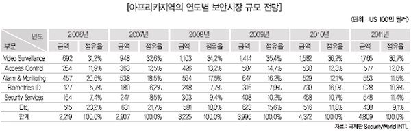 ¤ýÁö³ÇØ Àü ¼¼°è º¸¾È½ÃÀåÀÇ ¾à 3.8%ÀÎ 32¾ï ´Þ·¯¿¡ ´ÞÇÑ °ÍÀ¸·Î Áý°èµÈ ¾ÆÇÁ¸®Ä« º¸¾È½ÃÀåÀº ¿ÃÇØ ¾à 7¾ï ´Þ·¯ Áõ°¡ÇÑ 39¾ï ´Þ·¯¿¡ ´ÞÇÏ¸é¼ Àüü ½ÃÀåÀÇ 4.4%¸¦ Â÷ÁöÇÒ °ÍÀ¸·Î Àü¸ÁµÊ.