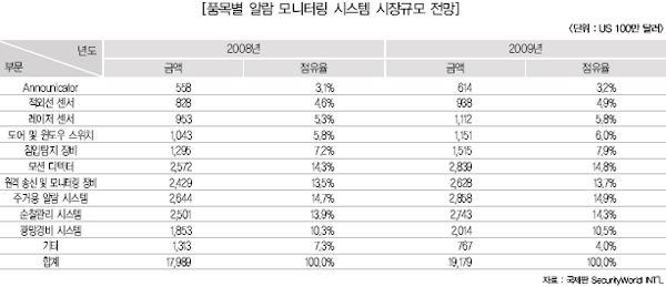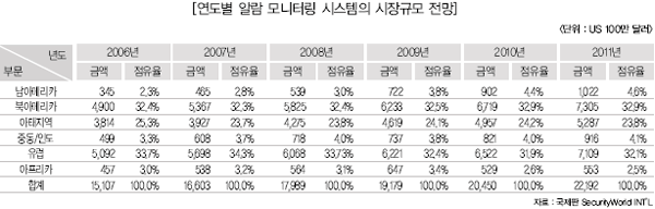 ¤ýÀü ¼¼°è ¾Ë¶÷¸ð´ÏÅ͸µ ½ÃÀåÀº 2007³â 166¾ï ´Þ·¯¿¡¼ 2008³â¿¡´Â 8.3% »ó½ÂÇÑ 179¾ï ´Þ·¯¿¡ ´ÞÇß°í, 2011³â¿¡´Â 221¾ï ´Þ·¯¿¡ ´ÞÇÒ °ÍÀ¸·Î Àü¸ÁµÊ. ¿¬ ¼ºÀ寸Àº 6~8%·Î ¿¹»óµÊ. ½ÃÀåÀº ±â¼úÁøº¸, ÅëÇսýºÅÛ, Å©·Î½ºÃ¤³Î Çõ½Å, ÀϹÝÀÎ ÀνÄÈ®»ê, º¸¾È°ü½É Áõ°¡ µî¿¡ ÈûÀÔ¾î Áö¼ÓÀûÀ¸·Î ¼ºÀåÇϰí ÀÖÀ½.
