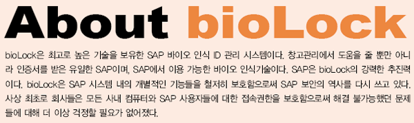 ½Ç½Ã°£ bioLockÀº ¹ÙÀÌ¿À ÀνÄÀ¸·Î PC Á¢±Ù ±ÇÇѰú Ã¥ÀÓ¼ºÀ» °ü¸®ÇÑ´Ù. ÀÌ·Î ÀÎÇØ »ý»ê¼ºÀÌ ³ô¾ÆÁö°í µ¿½Ã¿¡ ºñ¿ëµµ Àý°¨ÇÒ ¼ö ÀÖ´Ù.