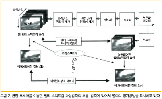 ³»Ãß·² ºñÀü¿¡¼´Â »ö ÀçÇö¼ºÀ» Âü°íÇÑ ¸ÖƼ ½ºÆåÆ®·³ È»ó¾ÐÃàÀÌ ÇÊ¿äÇÏ´Ù. ±× Ư¼ºÀ¸·Î¼´Â ¼¼ °³ ÀÌ»óÀÇ »ö ä³ÎÀ» ´Ù·ç´Â °Í, ¼¼ °³ÀÇ Ã¤³ÎÀÌ¶óµµ Ç¥ÁØÀûÀÎ RGB¿ÜÀÇ °ÍÀ» ´Ù·ç±â À§ÇØ °¢ ä³Î »öÀ̳ª ½ºÆåÆ®·³ÀÇ °ü°è¸¦ Ç¥½ÃÇÏ´Â ¸ÞŸ µ¥ÀÌÅ͸¦ ÀÌ¿ëÇÏ´Â °ÍÀ» ¿°µÎÇϰí ÀÖ´Ù. ¶ÇÇÑ, ¾ÐÃà¿¡ µû¸¥ ¿(æë)ÈÀÇ Æò°¡´Â ¸ÖƼ ½ºÆåÆ®·³ È»óÀÇ PSNR¿¡ º¸ÅÂ¾î »ö ÀçÇö °á°ú È»óÀÇ »ö Â÷ÀÌ µîÀ» Âü°íÇÒ Çʿ䰡 ÀÖ´Ù.