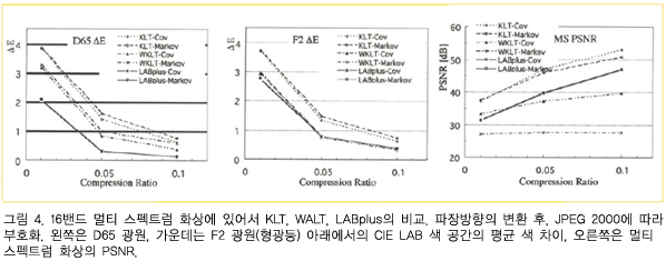 ±×¸² 4´Â 16¹êµåÀÇ ¸ÖƼ ½ºÆåÆ®·³ È»ó¿¡ KL º¯È¯, WKLT, LABplus¸¦ Àû¿ëÇÑ °æ¿ìÀÇ °á°ú¸¦ ³ªÅ¸³»°í ÀÖ´Ù. PSNR·Î¼´Â KL º¯È¯ÀÌ ÃÖ°í·Î ³ôÀº °ªÀ» ³ªÅ¸³»Áö¸¸ »ö ÀçÇöÀÇ Á¤µµ¿¡¼ º¸¸é WKLTÀ̳ª LABplus°¡ ¶Ù¾î³ª´Ù. ¿©±â¿¡¼´Â CIE D65 Ç¥ÁØ ±¤¿øÀ» ÀÌ¿ëÇÏ¿© °¡½Ã¼ººÐÀ» »êÃâÇϰí ÀÖÁö¸¸ ÀÌ ¿ÜÀÇ ±¤¿ø¿¡¼µµ »ö Â÷ÀÌ´Â WKLT¿Í µ¿ÀÏÇÏ°Ô ³ªÅ¸³ª°í ÀÖ´Ù.