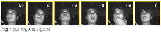 Á¦¾È ¹æ¹ý¿¡¼´Â ÁÖ±âÀÇ ÇÇÅ© ºÎ±Ù¿¡¼µµ ±âÁØÄ¡¿Í °ÅÀÇ ÀÏÄ¡ÇÑ °á°ú¸¦ ¾ò°í ÀÖÀ¸¸ç ¾ÈÁ¤µÈ ÃßÁ¤ÀÌ °¡´ÉÇØÁ³´Ù. ±×¸² 7¿¡¼´Â ÀÚ¼¼ ÃßÁ¤ ½ÃÀÇ È»ó ¿¹¸¦ ³ªÅ¸³½´Ù. ÃßÁ¤ °á°ú·Î ¾ó±¼ÀÇ ¹æÇâ º¤Å͸¦ ºñ°ø°£ Á߽ɿ¡¼ÀÇ Á÷¼±À¸·Î ±×¸²À» ±×·Á °¢ Ư¡Á¡ÀÇ 3Â÷¿ø ÁÂǥġ¸¦ È»ó »ó¿¡ Åõ¿µÇÑ °á°ú¸¦ ½ÊÀÚÁ¡À¸·Î Ç¥½ÃÇÏ¿´´Ù. (a)~(c)ÀÇ Åë»óÀÇ ÀÚ¼¼ º¯È¿¡ ´õÇÏ¿© (d)ÀÇ ÀÔÀ» Å©°Ô ¹ú¸° °æ¿ì³ª, (e) (f)ÀÇ ÀÔÀ̳ª ´«½çÀ» °¡¸° °æ¿ìµµ ÃßÁ¤ÇÒ ¼ö ÀÖ°Ô µÇ¾î ÀÖ¾î Æ¯º°ÇÑ °æ¿ì¿¡ ´ëÇÑ ÃßÁ¤µµ °¡´ÉÇØÁ³´Ù.