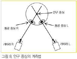 ¿ì¼± µ¿°ø Á߽ɰú ¾È±¸ Áß½ÉÀ» ÀÕ´Â º¤Å͸¦ ½Ã¼± º¤ÅÍ·Î °¡Á¤ÇÑ´Ù. ¾È±¸ Áß½ÉÀº Ȼ󿡼 Á÷Á¢ÀûÀ¸·Î °ËÃâÇÒ ¼ö ¾ø±â ¶§¹®¿¡ ¸Ó¸® ¸ðµ¨¿¡ ´ëÇÑ À§Ä¡¸¦ ¹Ì¸® ÃßÁ¤ÇØ µÐ´Ù. ¿©±â¿¡´Â ¸Ó¸® ¸ðµ¨À» µî·ÏÇÒ ¶§ÀÇ È»ó ÃÔ¿µ ½Ã¿¡ Ä«¸Þ¶ó L ¹× RÀÇ ·»Áî Áß½ÉÀ» º¸°í ÀÖ´Â »óÅ¿¡¼ÀÇ È»óÀ» ÇÔ²² ÃÔ¿µÇØ µÎ°í °¢°¢ÀÇ È»ó¿¡¼ µ¿°ø Áß½ÉÀÇ È»ó ÁÂÇ¥¸¦ ¼öµ¿À¸·Î °áÁ¤ÇÑ ÈÄ ½ºÅ×·¹¿À °èÃø¿¡ ÀÇÇØ 3Â÷¿ø ÁÂÇ¥¸¦ °è»êÇÑ´Ù. ¶ÇÇÑ Ä«¸Þ¶ó º¸Á¤(Camera Calibration)À¸·Î ¾òÀº ·»Áî Áß½ÉÀÇ 3Â÷¿ø ÁÂÇ¥¿Í µ¿°ø Áß½ÉÀÇ 3Â÷¿ø ÁÂÇ¥¿¡¼ ½Ã¼± º¤Å͸¦ ±¸ÇÏ¿© °¢°¢ÀÇ º¤ÅÍÀÇ ±³Á¡À» ¾È±¸ Áß½ÉÀÇ 3Â÷¿ø ÁÂÇ¥·Î ÇÑ´Ù.