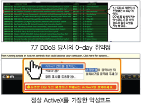 À¥ ºê¶ó¿ìÀú È®Àå ¸ðµâÀº ÀÎÅͳÝÀ» »ç¿ëÇϱâ À§ÇÑ Internet Explorer¿Í °°Àº À¥ ºê¶ó¿ìÀú¿¡¼ »ç¿ëµÇ´Â ActiveX ¸ðµâÀ» ¸»ÇÑ´Ù. ActiveXÀÇ ÀÚü Ãë¾àÁ¡À» ÀÌ¿ëÇϰųª ¾ÇÀÇÀûÀÎ ¸ñÀûÀÇ ActiveX¸¦ Á¤»ó ActiveX·Î °¡ÀåÇÏ¿© ¾Ç¼ºÄÚµå À¯Æ÷°¡ ¹ß»ýµÉ ¼ö ÀÖÀ¸¸ç ActiveXÀÇ ÀÚü Ãë¾àÁ¡À» ÀÌ¿ëÇÒ °æ¿ì »ç¿ëÀÚÀÇ ½ÇÇàÀ» À¯µµÇÏ¿© ¾Ç¼ºÄڵ尡 °¨¿°µÇ´Â °ÍÀÌ ¾Æ´Ñ º»Àεµ ¸ð¸£°Ô °¨¿°ÀÌ ÁøÇàµÉ ¼ö ÀÖ´Â À§Ç輺ÀÌ Á¸ÀçÇÑ´Ù. ActiveX ÀÚü Ãë¾àÁ¡À» ¼³¸íÇÏÀÚ¸é, ActiveX ±â¼úÀº À©µµ¿ì¸¦ ±¸¼ºÇÏ´Â COMÀ̶ó´Â °³³ä°ú µ¿ÀÏÇÑ °øÅë °´Ã¼ ¸ðµ¨À» ÀǹÌÇϸç À¥ ºê¶ó¿ìÀú(Internet Explorer)¿¡¼ ClassID¸¦ ÀÌ¿ëÇÏ¿© È£ÃâÀÌ °¡´ÉÇϱ⠶§¹®¿¡ ¹ü¿ëÀûÀ¸·Î »ç¿ëµÇ´Â À©µµ¿ìÀÇ ActiveX °ü·Ã Ãë¾àÁ¡µéÀ» À¥ ºê¶ó¿ìÀú¸¦ ÅëÇØ È£ÃâÇÏ¿© ¾Ç¿ëÇÒ ¼ö ÀÖ´Â °ÍÀ» ÀǹÌÇÑ´Ù. ÀÌ·± ActiveX ÀÚüÀÇ Ãë¾àÁ¡ÀÌ À§ÇèÇÒ ¼ö ÀÖ´Â °ÍÀº Ãë¾àÁ¡ ÆÐÄ¡°¡ ÀÌ·ç¾îÁöÁö ¾ÊÀº À©µµ¿ìÀÇ 0-day »óÅÂÀÇ ActiveX Ãë¾àÁ¡Àº À¥ ºê¶ó¿ìÀú¸¦ ÅëÇØ ´ë±Ô¸ð ¾Ç¼ºÄÚµå À¯Æ÷¿¡ ÀÌ¿ëµÉ À§Ç輺ÀÌ Á¸ÀçÇϱ⠶§¹®ÀÌ´Ù. ¾ó¸¶ Àü ¹ß»ýÇÑ 7.7 DDoS ´ë¶õÀÌ ÀϾ±â Àü À©µµ¿ìÀÇ ActiveX °ü·Ã 0-day Ãë¾àÁ¡ 2°³°¡ Á¸ÀçÇß´ø °ÍÀ¸·Îµµ ÇØ´ç Ãë¾àÁ¡À» ÀÌ¿ëÇÏ¿© DDoS °ø°ÝÀ» ÀÏÀ¸Å°´Â ¾Ç¼ºÄڵ带 ´ë·®À¸·Î À¯Æ÷½Ãų ¼ö ÀÖÁö ¾Ê¾Ò´ÂÁö À¯ÃßÇØº¼ ¼ö ÀÖ´Ù.