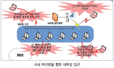Wibro¿Í °°Àº À̵¿Åë½Å¸Á ±â¹ÝÀÇ ¹«¼±·£ ¼ºñ½º¸¦ »ç³»¸Á PC¿¡¼ ÀÌ¿ëÇÒ °æ¿ì À̵¿Åë½Å»ç¿¡¼ ÇÒ´ç¹ÞÀº IP¸¦ ÅëÇØ ÇØ´ç PC¿Í ¿¬°áµÈ ³»ºÎ¸Á°ú Åë½ÅÇÒ ¼ö ÀÖ´Â Á¢±Ù °æ·Î°¡ ¹ß»ýÇÏ¿© ¿ÜºÎ ºñÀΰ¡ÀÚ¿¡°Ô Á¢±Ù °¡´ÉÇÑ ¹éµµ¾î¸¦ ¿¾îÁÖ´Â °Í°ú °°Àº ¿ªÇÒÀ» ¼öÇàÇÏ°Ô µÈ´Ù. ¶ÇÇÑ Wibro Åë½ÅÀ» ÅëÇÏ¿© ÀÎÅͳݿ¡ Á¢¼ÓÇÏ´Â °ÍÀº ±â¾÷ÀÇ º¸¾ÈÁ¤Ã¥µéÀ» ¿ìȸÇϱ⠶§¹®¿¡ ³»ºÎ º¸¾È °ü¸®»ó ¹®Á¦°¡ µÉ ¼ö ÀÖ´Ù.