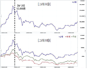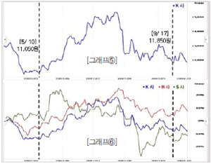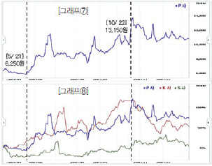 ´ë±â¾÷ ¸¶Áö¸· »ç·Ê·Î Àü¡¤ÇöÁ÷ Á÷¿øµéÀÇ °ø¸ð·Î ±â¼úÀÌ ÇØ¿Ü·Î À¯ÃâµÈ K»çÀÇ °æ¿ìÀÌ´Ù. ±×·¡ÇÁ¨ë¿¡¼ ±â¼úÀ¯Ãâ ÃÖÃÊ º¸µµ(2007.5.10) ÀÌÈÄ ÁÖ°¡´Â ¿ÀÈ÷·Á »ó½Â°î¼±À» ±×¸®°í ÀÖ´Ù. µ¿Á¾¾÷°è ±×·¡ÇÁ¨ì¿¡¼ H»ç, S»ç ¸ðµÎ K»ç µî¶ôÀ²°ú ¸¹Àº Â÷À̰¡ ¾øÀ½À» ¾Ë ¼ö ÀÖ´Ù. °á±¹ K»çÀÇ °æ¿ìµµ º¸¾È»ç°í°¡ Á÷Á¢ÀûÀ¸·Î ÁÖ°¡¿¡ ¿µÇâÀ» Áá´Ù°í º¸±â´Â Èûµç »óȲÀÌ´Ù.