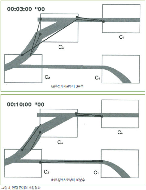 4´ëÀÇ Ä«¸Þ¶ó¿¡ ÀÇÇÏ¿© ÃÔ¿µµÈ 30ºÐ°£ÀÇ ¿µ»óÀ» »ç¿ëÇÏ¿© Ä«¸Þ¶óÀÇ ¿¬°á °ü°è¸¦ Â÷·Ê·Î ÃßÁ¤ÇÏ´Â ½ÇÇèÀ» Çß´Ù. Á¦¾È¼ö¹ý¿¡ ÀÇÇÏ¿© ÃßÁ¤°á°ú¸¦ ±×¸² 4¿¡¼­ º¼ ¼ö ÀÖ´Ù. ÀÌ ±×¸²¿¡ ÀÇÇÏ¿© ¼±ºÐÀÌ ÃßÁ¤µÈ ¿¬°á°á°ú¸¦ Ç¥ÇöÇÏ°í ¡Ü°¡ ±× ½ÃÁ¡À» ³ªÅ¸³½´Ù. Áö¸éÀÇ µµÇÕ »ó »ó¼¼ÇÑ °á°ú´Â ³ªÅ¸³ªÁö ¾ÊÁö¸¸, Á¦¾È¼ö¹ý¿¡ ÀÇÇÏ¿© ¿¬°á °ü°èÀÇ ÃßÁ¤Àº °üÃø½Ã°£ÀÌ Âª°í ´ë»óÀÇ °üÃø¼ö°¡ ÀûÀº °æ¿ì¿¡µµ Á¤È®ÇÏ°Ô Àß ÇàÇØÁ³´Ù´Â °ÍÀ» ¾Ë ¼ö ÀÖ´Ù. °üÃø°³½Ã·ÎºÎÅÍ 3ºÐ °æ°ú ½ÃÁ¡¿¡ À־ ¿Ã¹Ù¸¥ ¿¬°á°á°ú°¡ ÃßÁ¤µÇ±â ½ÃÀÛÇß´Ù.