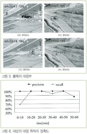 ÃßÀû´ë»óÀÇ °üÃø¼ö¿Í ´ëÀÀºÎ °£ÀÇ ¼º°ø·ü °ü°è¸¦ Á¶»çÇϱâ À§ÇÏ¿© °üÃø°³½Ã·ÎºÎÅÍ 10ºÐ °£°ÝÀ¸·Î °üÃøµÈ ÃßÀû´ë»óÀÇ ´ëÀÀ¼º°ø·üÀ» ÃøÁ¤Çß´Ù. ÃßÁ¤°á°ú¸¦ ½Ã°£º°·Î ÀûÇÕ·ü(Precision)°ú ÀçÇö·ü(recall)·Î Æò°¡ÇÑ °ÍÀ» ±×¸² 6¿¡ ³ªÅ¸³Â´Ù. ¿©±â¼­ ÀûÇÕ·ü°ú ÀçÇö·üÀº ¾Æ·¡ÀÇ °ø½ÄÀ¸·Î ±¸Çß´Ù.