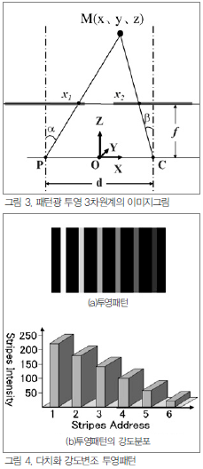 ±×¸² 3Àº ÆÐÅϱ¤ Åõ¿µ 3Â÷¿ø È­»ó°èÃø ½Ã½ºÅÛÀÇ À̹ÌÁö ±×¸²À» ³ªÅ¸³½´Ù. M(x,y,z)Àº °èÃøÁ¡, P´Â Åõ±¤±âÀÇ ·»ÁîÁß½É, C´Â Ä«¸Þ¶óÀÇ ·»ÁîÁß½É, f´Â ÃÊÁ¡°Å¸®ÀÌ´Ù. °èÃøÁ¡ÀÇ XÁÂÇ¥¿Í YÁÂÇ¥´Â »ï°¢°ü°è·Î °£´ÜÇÏ°Ô ±¸ÇØÁö°í, ±æÀÌÄ¡ Z´Â (1)½Ä°ú °°ÀÌ Åõ¿µ ÁÙ¹«´ÌÀÇ ¹æÇâÁ¤º¸·ÎºÎÅÍ °è»êÇÒ ¼ö ÀÖ´Ù.